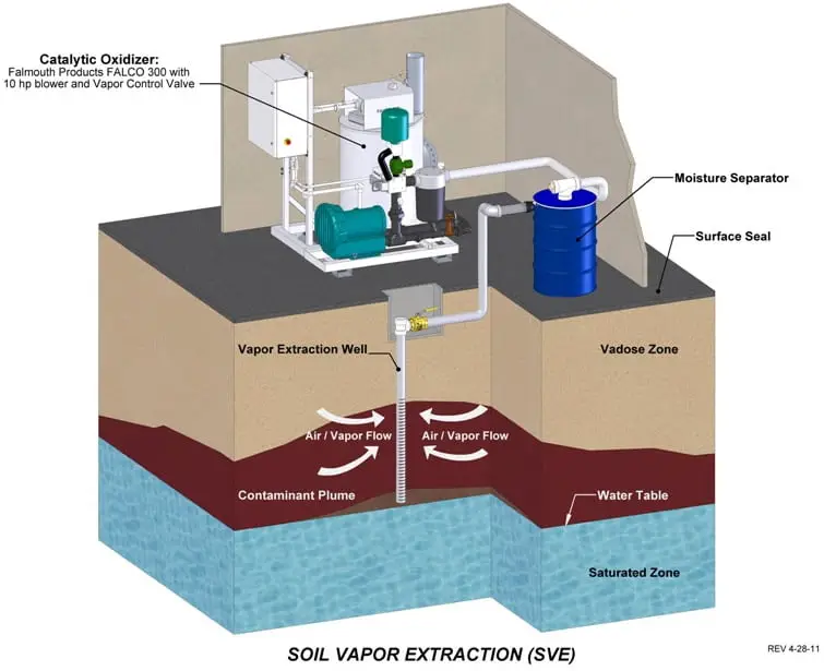 Soil vapor extraction (SVE) is an in situ remediation strategy used to clean up petroleum contaminated soils. An SVE vacuum pump (blower) is used to apply vacuum to vertical or horizontal screened extraction wells installed in or near the contamination source. Air moves through the soil volatilizing contaminants dispersed above the water table. The vapor is pulled into the SVE well and discharged from the blower to a treatment device.