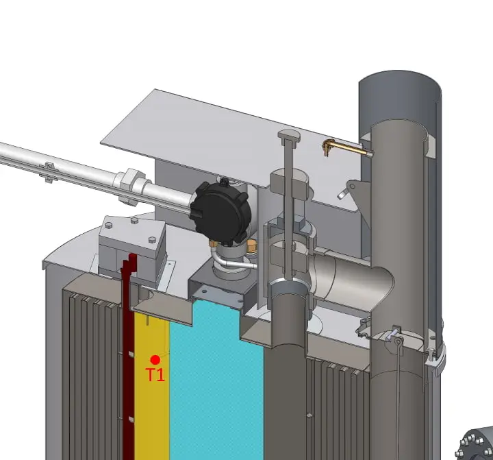 Hot vapors enter the catalyst inlet plenum and flow velocity is dropped. Catalyst inlet temperature (T1) is measured with a thermocouple.