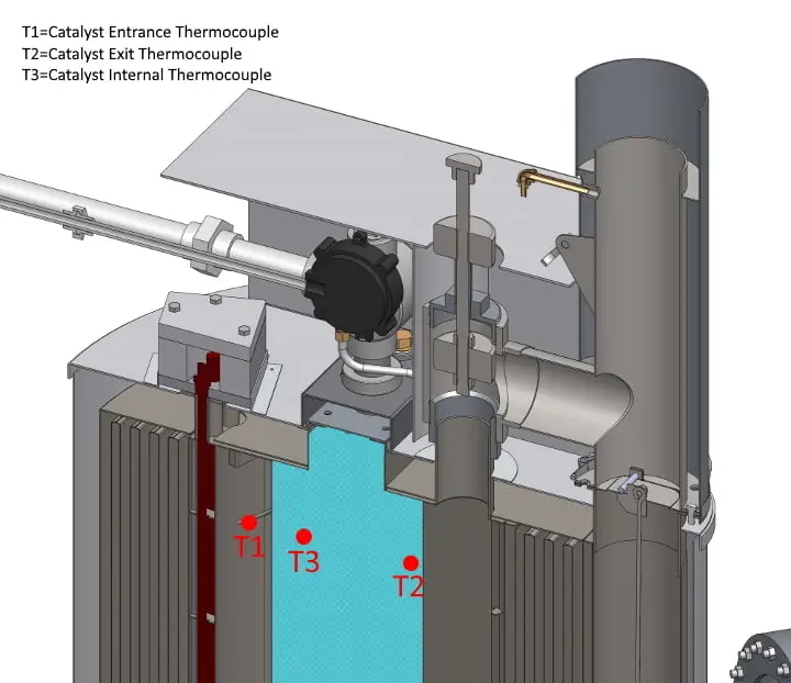 Catalyst operating temperature is between 330˚C and 600˚C. Temperature rise is measured at the catalyst midpoint (T3), and on the discharge (T2). The temperature control system receives input from all three thermocouples and regulates dilution air to control input concentrations.