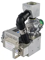 The VCV includes a valve body, valve disc, two valve seats, and a small gear motor. The motor progressively opens and closes the valve in response to input from the three temperature controllers. The valve simultaneously regulates dilution air and source vapors by positioning the valve disc. Controller rate alarms regulate how quickly the VCV introduces vapors. A solenoid valve provides rapid introduction of dilution air, regardless of valve position. The valve automatically returns to its closed position each time FALCO catalytic oxidizer power is cycled. View an interactive demonstration of the process.