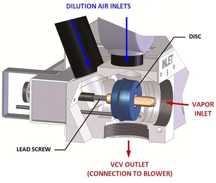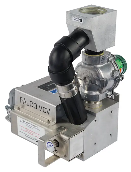 The VCV includes a valve body with two valve seats, valve disc, and a gear motor. The motor progressively opens and closes the valve in response to input from the oxidizer’s three temperature controllers. The valve simultaneously regulates dilution air and source vapors by positioning the valve disc. Controller rate alarms regulate how quickly the VCV introduces vapors. A solenoid valve provides rapid introduction of dilution air, regardless of valve position. The VCV automatically returns to its closed position each time FALCO power is cycled.